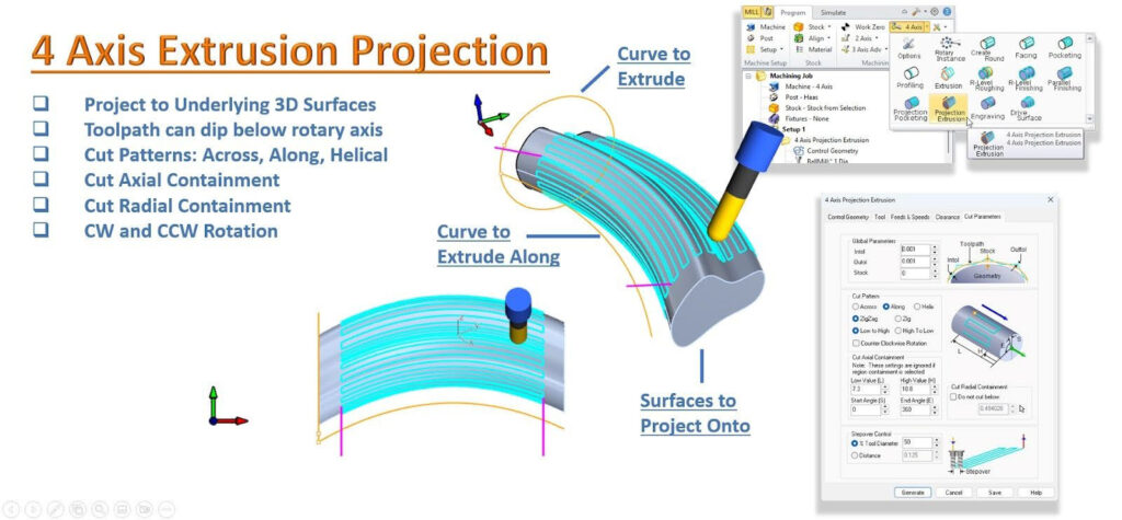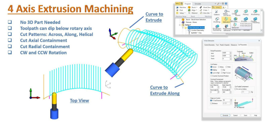 「Across(横)」「Along(沿い)」「Helical(らせん)」などのパターンに対応した 4 軸押し出し加工が追加され、複雑形状の加工柔軟性が向上しました。