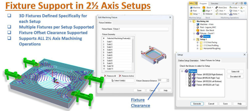 各セットアップごとに専用の 3D 治具を割り当てられ、複数治具を扱う加工シナリオにも対応できるようになりました。