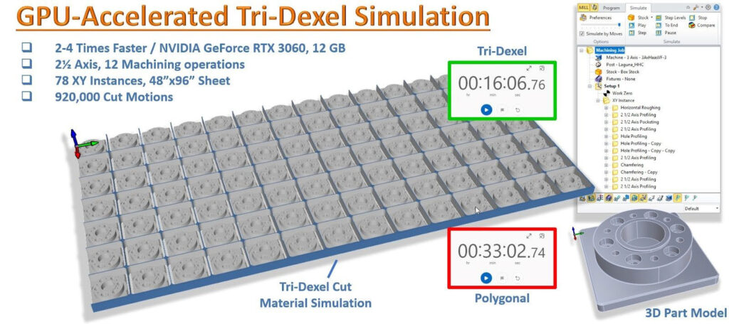 GPU を活用した新しい Tri‑Dexel シミュレーションにより、2.5 軸~5 軸までの加工シミュレーションが高速化され、高密度ツールパスでも快適に確認できます。